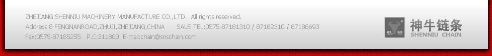 With its speedy development, the company has formed the productive capacity on chains reaching the annual output of 3,000 tons, and is capable of providing various kinds of roller chains based on the users' requirements and of providing non-standard chains used for the industrial flow lines and other serial products. The chain named “Shen'niu” produced by us is adopted the design and manufacture method of CAD and CAM, selected the fine-quality alloy steel and advanced method of heat treatment and is adopted strict and scientific control measures of quality, our products thus have gained higher reputations in the international and domestic markets, with stronger competitive capability of the market. Presently, our products are popular in over ten countries and areas such as Europe , USA and Southeast Asia , etc. Our company is possessed of self-supporting import-export authority.